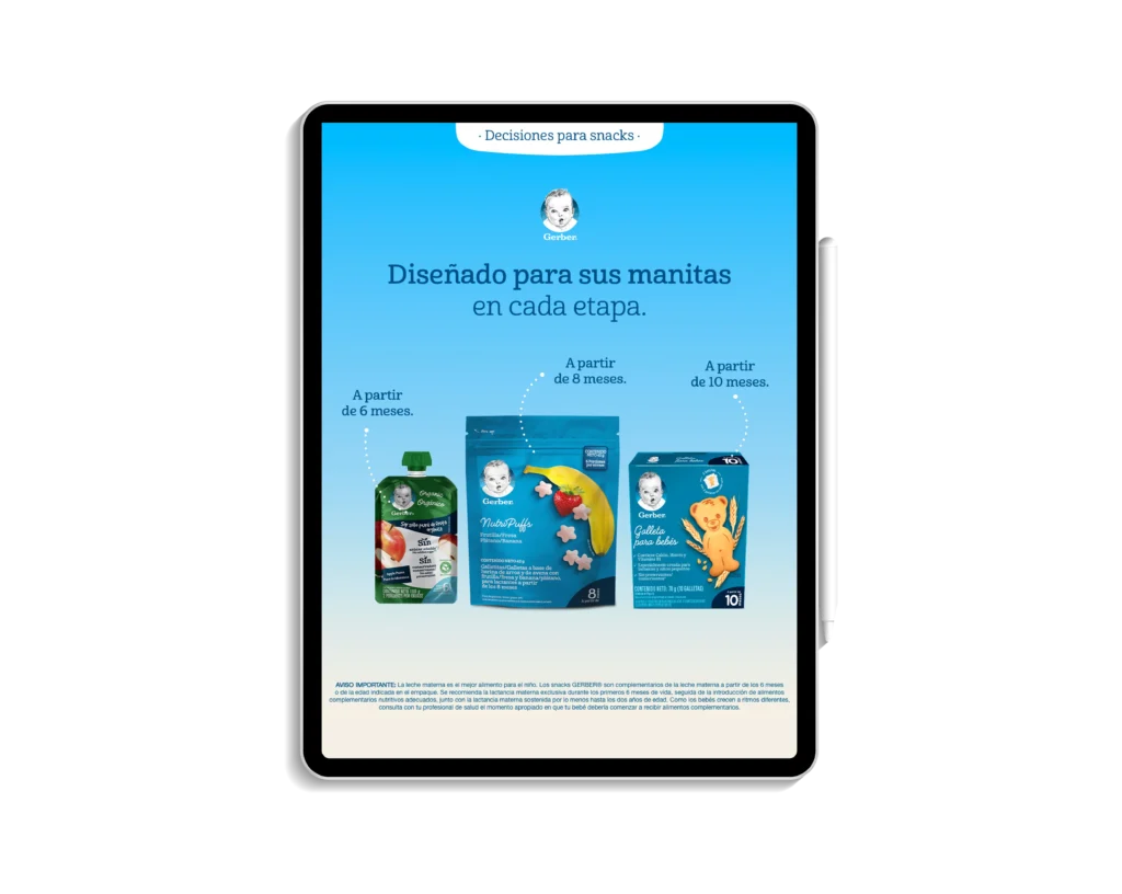 Las compotas GERBER® son adecuadas desde los 6 meses en adelante, los Puffs GERBER® desde los 8 meses en adelante y las Galletas GERBER® desde los 10 meses en adelante.