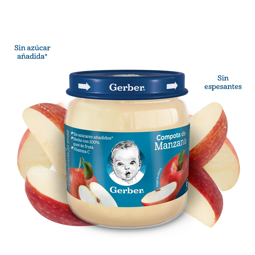 Los azúcares totales aportados por las compotas GERBER® son los naturalmente presentes en el puré de fruta.